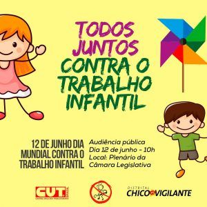 No Dia Mundial Contra o Trabalhado Infantil, 12 de junho, a Câmara Legislativa do Distrito Federal (CLDF) realizará audiência pública para fortalecer a campanha. O evento acontece a partir das 10h e contará com a participação de parlamentares, representantes do FNPETI, dirigentes sindicais, Ministério Público do Trabalho (MPT) e outros.
