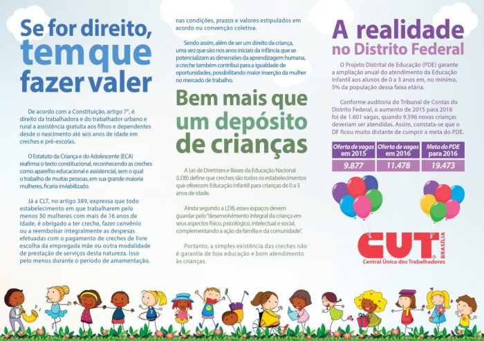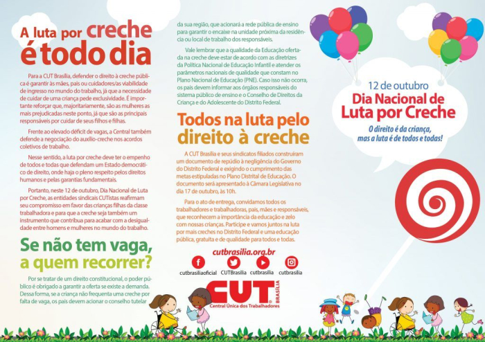 Na próxima terça (10), o Coletivo de Mulheres da CUT Brasília realizará ato alusivo ao Dia Nacional de Lutas por Creches, celebrado em 12 de outubro. A atividade acontecerá no Areal, Região Administrativa com maior deficiência de vagas em creches no DF, a partir das 10h.
